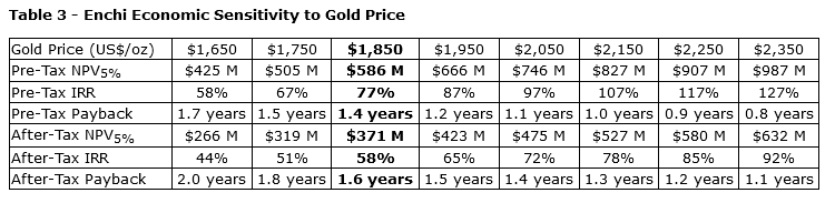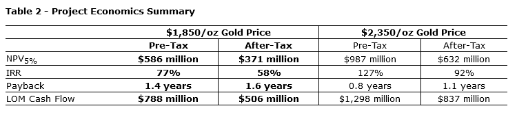 At a gold price of $1,850 per ounce: $586 million pre-tax net present value discounted at 5 per cent ("NPV5 per cent") and a 77 per cent pre-tax internal rate of return ("IRR"), $371 million after-tax NPV5 per cent and a 58 per cent after-tax IRR.