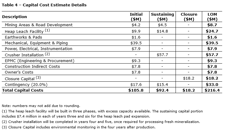An initial capital expenditure of $106 million (including 20 per cent contingency) has been estimated to construct the project, with a further $92 million in sustaining capital during operations and $18 million for closure (including reclamation). The capital cost estimate is based on an open pit mining and heap leach operation processing 8.1 mtpa utilizing contract mining.