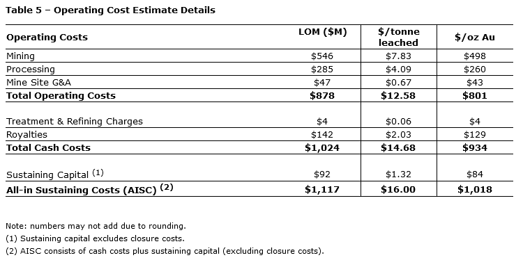 LOM operating costs estimated at $801 per ounce of gold, cash costs estimated at $934 per ounce of gold, LOM all-in sustaining costs (AISC) estimated at $1,018 per ounce of gold.