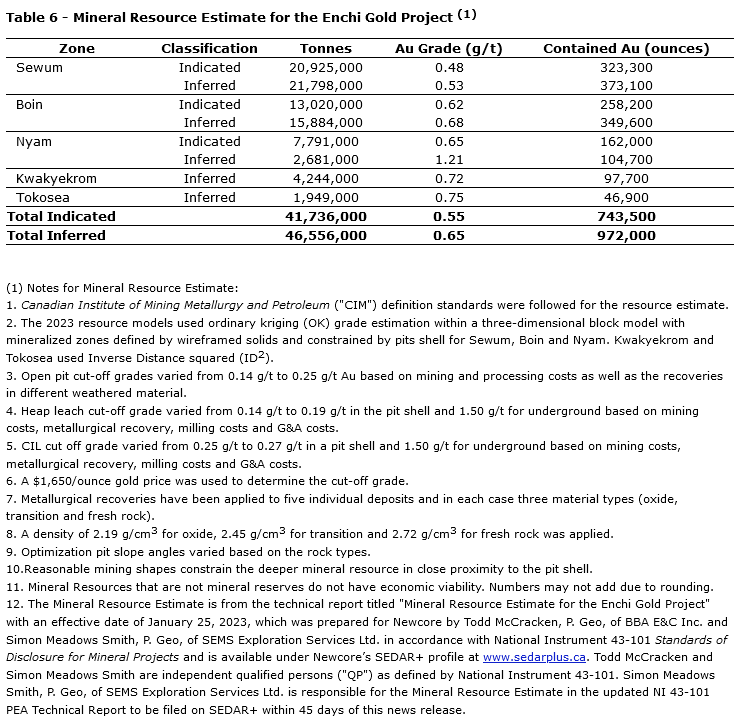 Greg Smith, VP Exploration of Newcore stated, "We believe that longer-term the project economics will benefit from the sizeable upside potential that exists at Enchi, with future resource expansion probable within not only the near-surface oxide and transition mineralization but also within the higher-grade structures defined at depth. The project has substantial untapped potential, with a strategic location along a gold belt that hosts sizable mining operations. Enchi's geological footprints align with those neighboring gold mines, with Newcore only just starting to define the potential of the project that is reminiscent of its neighbors that began small and grew significantly over time. We look forward to continuing to prove out this potential for size and scale with an exploration focus alongside driving development of the project going forward. As we advance Enchi with additional studies towards production, we will continue to prioritize working with our local communities to provide positive impacts, creating value for all stakeholders as we unlock the significant value potential at our Enchi gold project in Ghana."