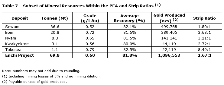 The PEA, with an effective date of April 24, 2024, contemplates an open pit, heap leach operation with a low strip ratio using contract mining and processing 8.1 mtpa (approximately 22,500 tonnes per day). The heap leach facility will be built in three phases, with excess capacity available for future expansion. Heap leach feed will be trucked from five deposits (Sewum, Boin, Nyam, Kwakyekrom, Tokosea) to a central crushing and heap leach facility which will be located between the Boin and Sewum deposits, which together host approximately 76 per cent of the Mineral Resources currently defined at Enchi. Secondary crushing capacity is assumed to only be required once the mine plan shifts to processing transitional and fresh rock mineralization, in the second half of the mine life, reducing the upfront capital cost requirements.