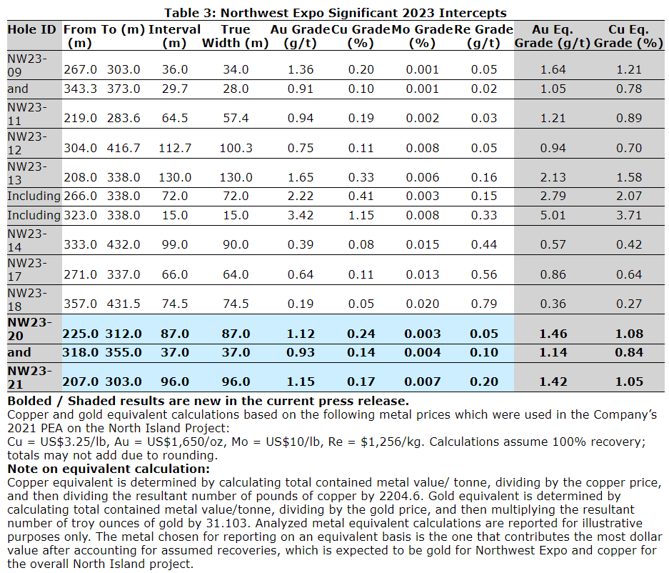Northisle Copper and Gold Inc. has released the first batch of drill results from its 2023 phase 3 program at Northwest Expo, which demonstrate continuity of the gold-rich Zone 1 in Northwest Expo.