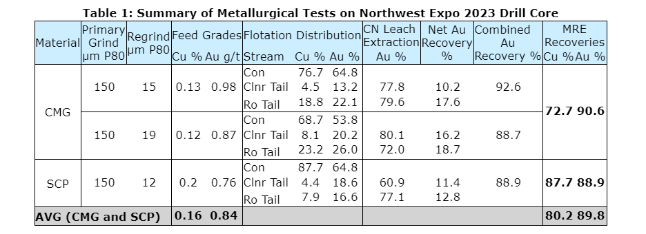 The table entitled "Summary of metallurgical tests on Northwest Expo 2023 drill core" summarizes the locked cycle flotation and leach results from tests conducted on chlorite-magnetite (CMG) and silica-clay-pyrite (SCP) composites. The average recoveries to be used in the mineral resource estimate are provided in the MRE recoveries columns. Gold recoveries are significantly better than the Hushamu and Red Dog recoveries (see the amended 2021 North Island copper and gold project preliminary economic assessment filed June, 2022) both from flotation alone and including leaching, while locked cycle flotation copper recoveries for Northwest Expo are marginally lower compared with Hushamu recoveries (85 per cent average), primarily due to lower average copper head grades.