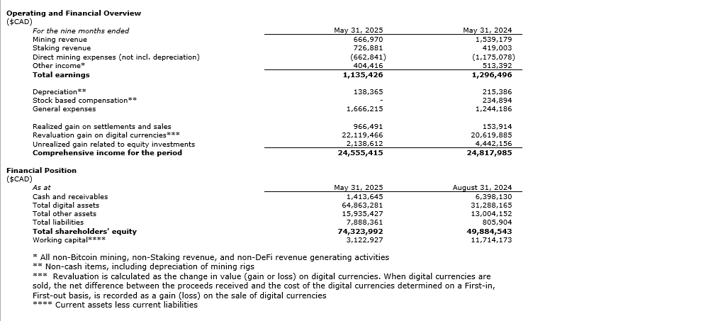 - Revenue update: Gross revenues for nine months ended May 31, 2025, reached $1.8-million, sourced from bitcoin mining, staking, defi (decentralized finance) and other activities. A decline from $2.5-million in the same period of the prior year reflects the impact of posthalving mining revenue reductions.