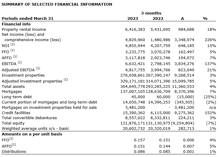 Net operating income (NOI) (1) in Q1 2023 was $4.9-million, an increase of 15.4 per cent from Q1 2022, primarily reflecting the strong year-over-year increase in rental income. The REIT generated net income attributable to unitholders of $4.8-million in Q1 2023 compared with $1.5-million in Q1 2022. The variance is primarily attributable to the change in fair value of investment properties, in addition to the impact of NOI (1) from newly acquired properties, partially offset by interest on mortgages associated with said properties.
