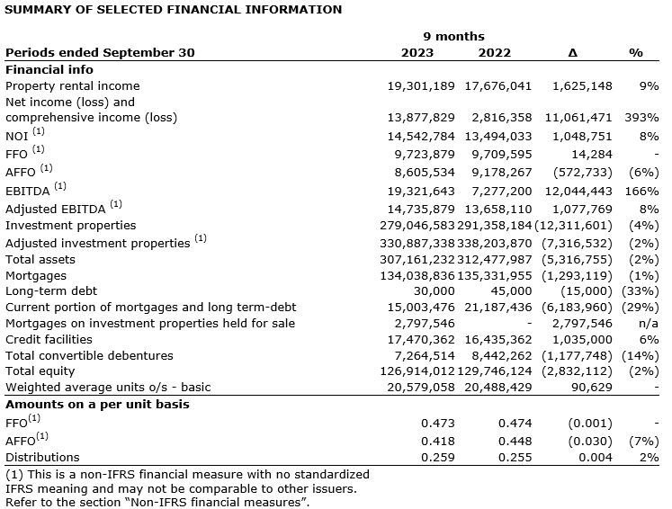 Rental income was $6.4-million in Q3 2023, an increase of 0.5 per cent from the three-month period ended Sept. 30, 2022. Net operating income in Q3 2023 was $4.8-million, an increase of 1.0 per cent from Q3 2022, primarily reflecting the year-over-year increase in rental income and partially offset by property dispositions.