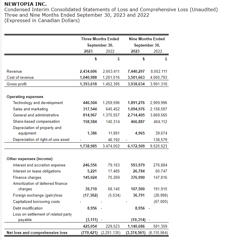 Newtopia Inc. has released its third quarter 2023 financial results and operational highlights and has filed the company's quarterly financial statements. These results pertain to the three and nine months ended Sept. 30, 2023. All amounts are expressed in Canadian dollars, unless otherwise noted.