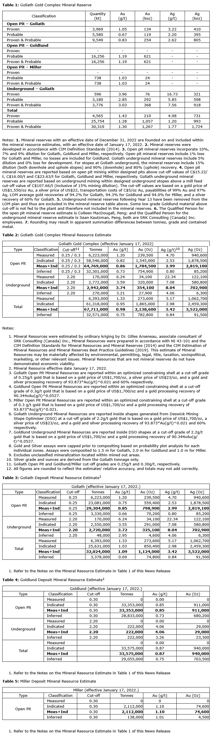 The Goliath complex mineral reserves and mineral resource estimate were published in a technical report entitled "Goliath Gold Complex -- NI 43-101 Technical Report and Prefeasibility Study," dated March 27, 2023 (with an effective date of Feb. 22, 2023), and was prepared by Ausenco Engineering Canada Inc. The technical report is available under the company's profile on SEDAR+ and on the company's website.