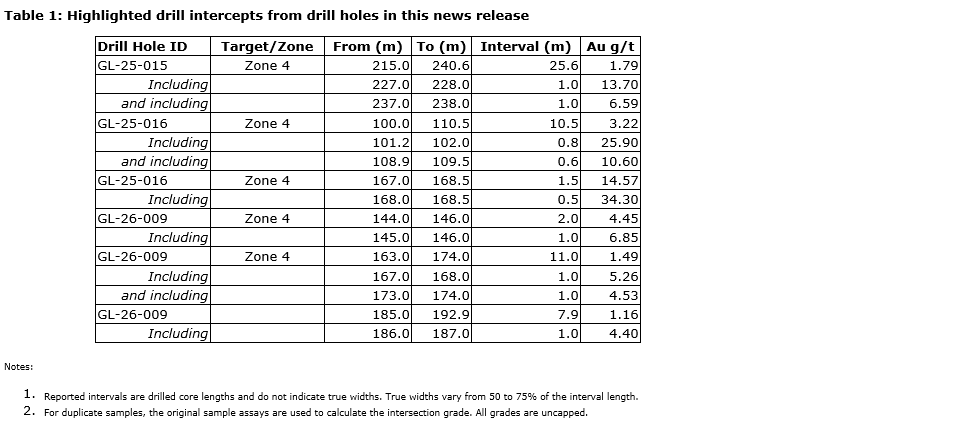 • 1.49 g/t gold over 11.0 metres (from 163.0 to 174.0 metres), including 5.26 g/t gold over 1.0 metre and 4.53 g/t gold over 1.0 metre, in drill hole GL-26-009.