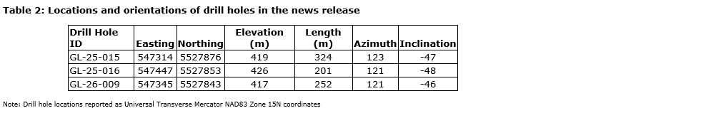 • 1.79 grams per tonne (g/t) gold over 25.6 metres (from 215.0 to 240.6 metres), including 13.70 g/t gold over 1.0 metre and 6.59 g/t gold over 1.0 metre, in drill hole GL-25-015;