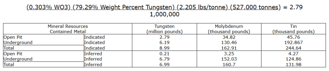 The Burnt Hill tungsten/molybdenum property now covers approximately 5,677 hectares in central New Brunswick and hosts a National Instrument 43-101 indicated resource of 1,761,000 tonnes within an open pit and underground averaging 0.292 per cent WO3 (tungsten trioxide), 0.007 per cent MoS2 (Molybdenum disulphide) and 0.008 per cent SnO2 (tin oxide), along with a further 1.52 million inferred tonnes averaging 0.263 per cent WO3, 0.008 per cent MoS2 and 0.005 per cent SnO2, as presented below. Also presented below, extracted from the 2013 resource report, is a statement of contained metal. In addition to the deposit area of the property, there are several other areas of identified tin, tungsten and molybdenum mineralization within the property boundary not yet at the resource stage.
