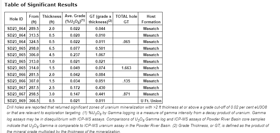 Powder River basin. Ten holes are reported with depths ranging from 350 to 600 feet. Five holes returned significant uranium grades and thicknesses. Grade thicknesses (GT) over the economic cut-off of 0.3 ranged from 0.41 to 1.216 in the three holes with anomalous mineralization detected in seven of the 10 holes.