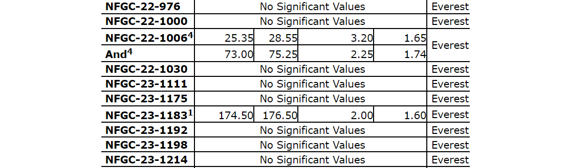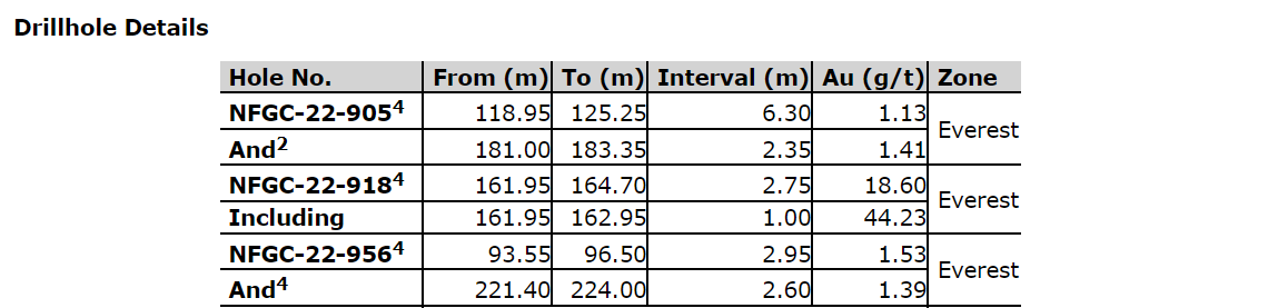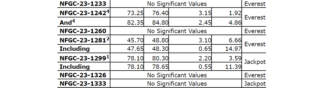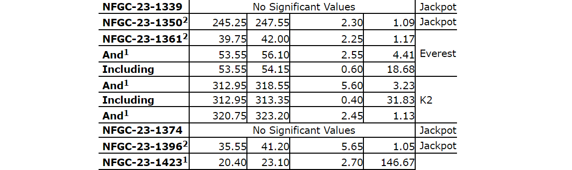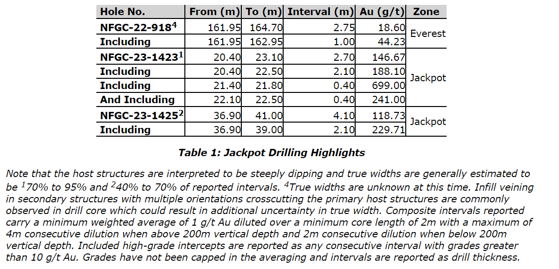Follow-up drilling, which includes today's holes, was designed to efficiently determine the orientation of the vein for continued expansion drilling. Intervals of 119 g/t Au over 4.10 m in NFGC-23-1425 and 147 g/t Au over 2.70 m in NFGC-23-1423 are located 20 m down dip and 15 m along strike, respectively, of previously reported