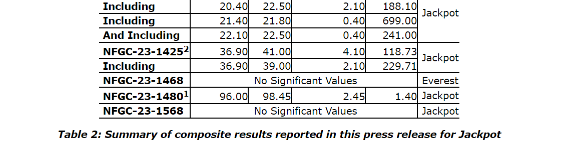 Jackpot is a new discovery that was announced on June 22, 2023, with the discovery hole interval of 95.7 grams per tonne gold over 3.25 metres in NFGC-23-1292, intercepted at a vertical depth of just 20 m and situated 280 m east of the AFZ.