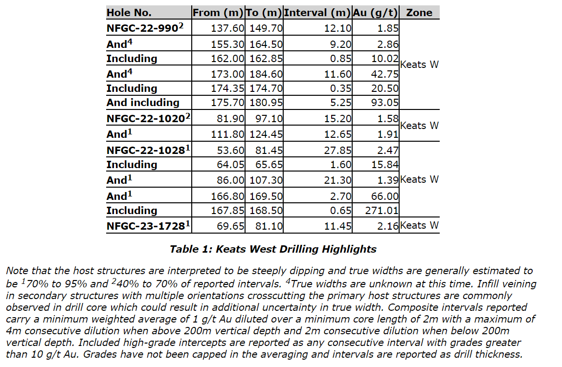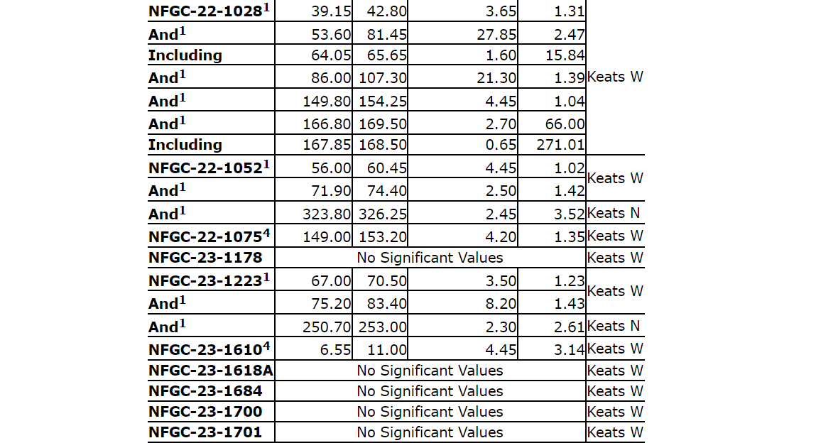 Intervals of 2.47 g/t Au over 27.85 m, 1.39 g/t Au over 21.3 m and 66 g/t Au over 2.7 m in NFGC-22-1028 are located 275 m down dip of previously released 6.68 g/t Au over 24 m in NFGC-22-784 (Jan. 24, 2023) and 85 m along strike of previously reported 17.2 g/t Au over 22.9 m and 12 g/t Au over 18.4 m in NFGC-22-1040 (April 25, 2023). This series of intervals defines a thick panel of gold mineralization that is over 50 m wide and represents an uplifted panel of the Keats West fault.