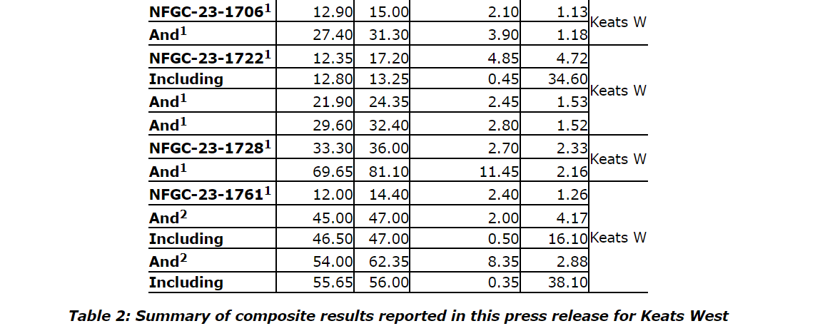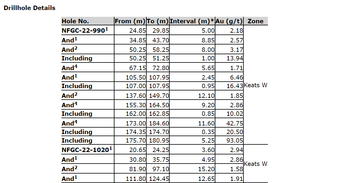 An interval of 42.8 grams per tonne gold over 11.6 metres in NFGC-22-990 was intersected in a 27 m stepout from previously reported 42.6 g/t Au over 32 m in NFGC-22-960 (Nov. 28, 2022), further defining one of the high-grade Keats West fault segments.