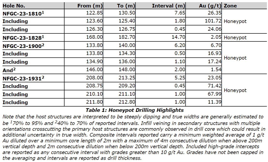 - 26.4 g/t Au over 7.65m in NFGC-23-1810, intersected at a vertical depth of 91m, and 23.1 g/t Au over 5.25m in NFGC-23-1931, located a further 100m down-dip, are part of a new discovery called Honeypot that was found along the east side of the AFZ, 230m north of Jackpot and 1.3km north of Lotto. This discovery was made as a result of a follow-up drill program testing a mineralized fault that was initially identified by grid drilling (Figures 1-4).