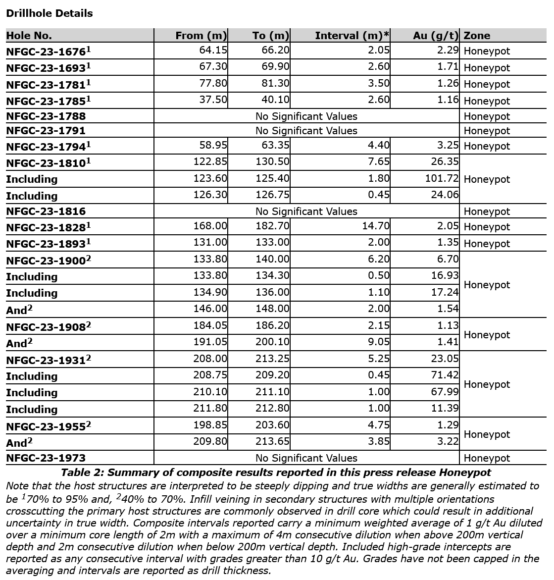 Melissa Render, VP of Exploration of New Found, stated: "Our first pass grid drilling reconnaissance program working north of Jackpot intersected a near-surface, brittle fault with characteristics similar to the other epizonal high-grade gold-bearing faults found along this segment of the AFZ. In following this structure to depth, we are finding that Honeypot is delivering encouraging high-grade results over significant widths. There is limited drilling in this area and we are eager to expand upon these high-grade results as we kick off our 2024 drill program."