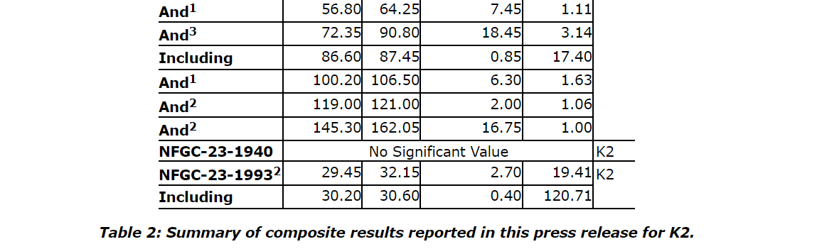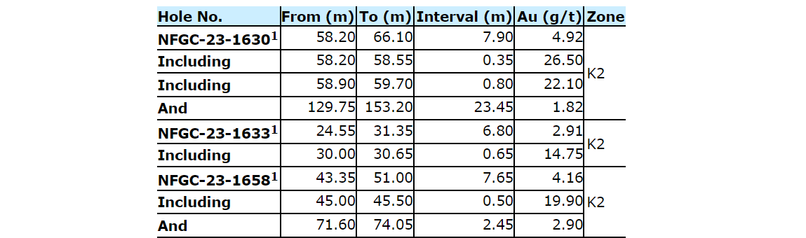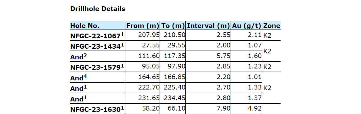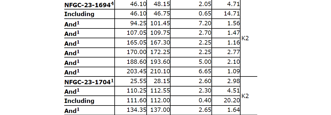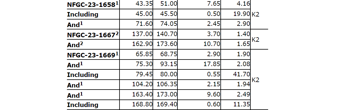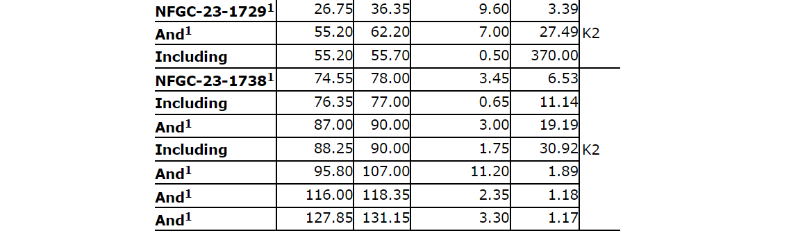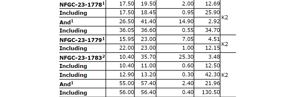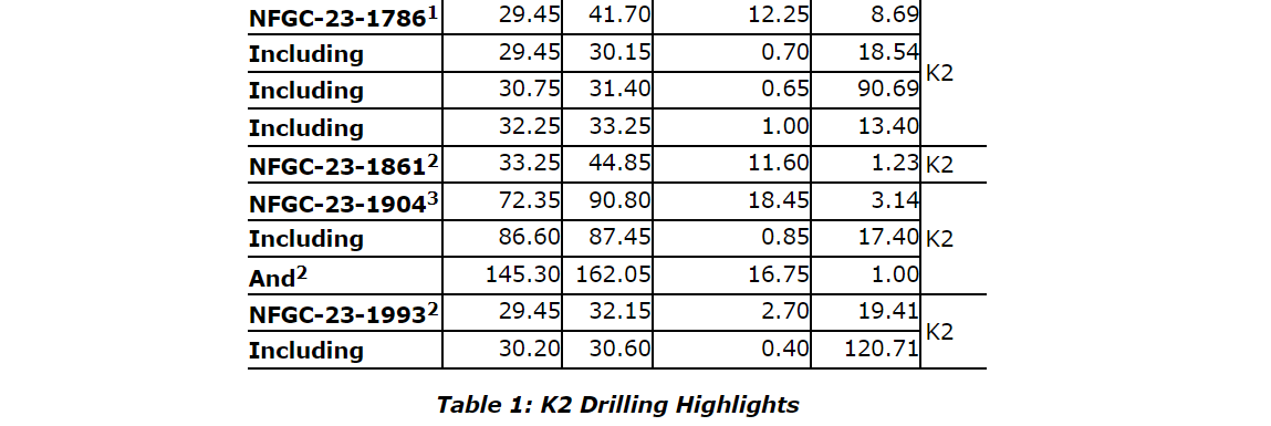 Additional near-surface highlight results from continuing expansion and definition drilling include: 3.48 g/t Au over 25.3 m and 22 g/t Au over 2.4 m in NFGC-23-1783; 6.18 g/t Au over 9.85 m and 3.01 g/t Au over 8.35 m in NFGC-23-1709; 3.14 g/t Au over 18.45 m in NFGC-23-1904; and 19.4 g/t Au over 2.7 m in NFGC-23-1993. All intervals occur shallowly above 65 m vertical depth and demonstrate strong continuity of gold mineralization across the K2 structure.