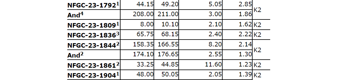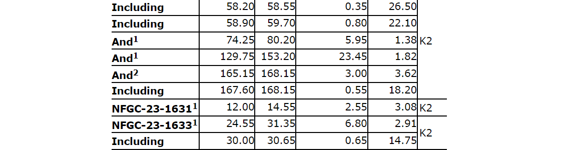 Intervals of 27.5 grams per tonne gold over seven metres and 3.39 g/t Au over 9.6 m in NFGC-23-1729 and 8.69 g/t Au over 12.25 m in NFGC-23-1786 were intersected as part of a program designed to extend a high-grade domain of the K2 structure back to surface and occur between 22 m and 43 m from surface, with the reported intercept lengths being close to true width.