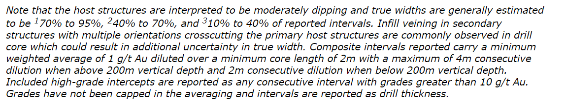 Assays are uncut, and composite intervals are calculated using a minimum weighted average of one g/t Au diluted over a minimum core length of two m with a maximum of four m consecutive dilution. Included high-grade intercepts are reported as any consecutive interval with grades greater than 10 g/t Au.