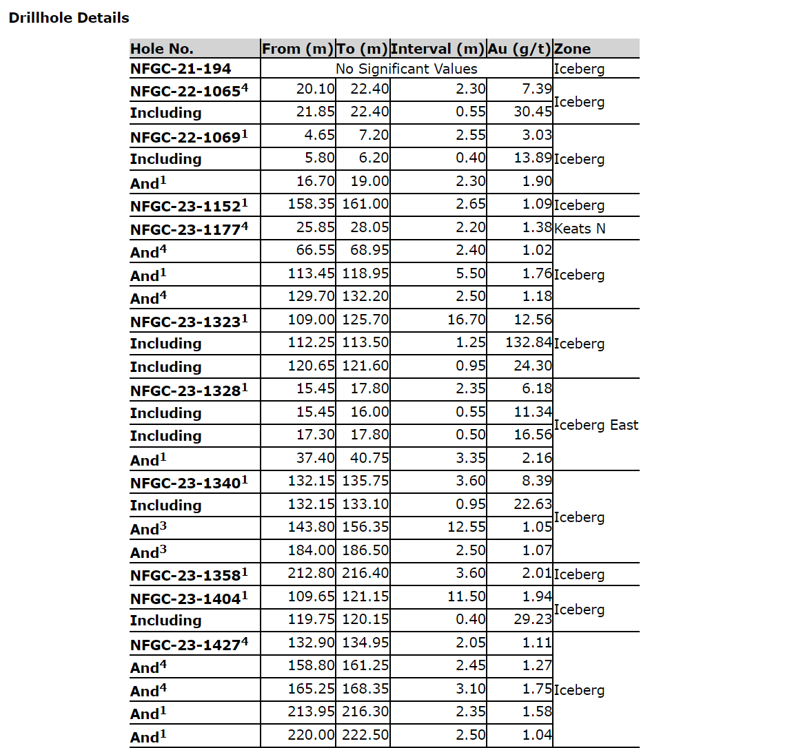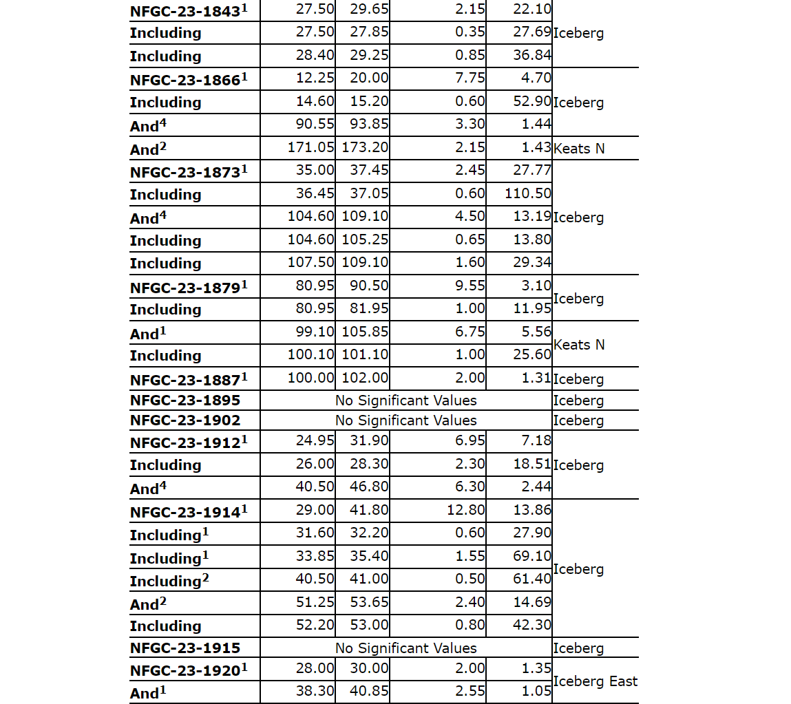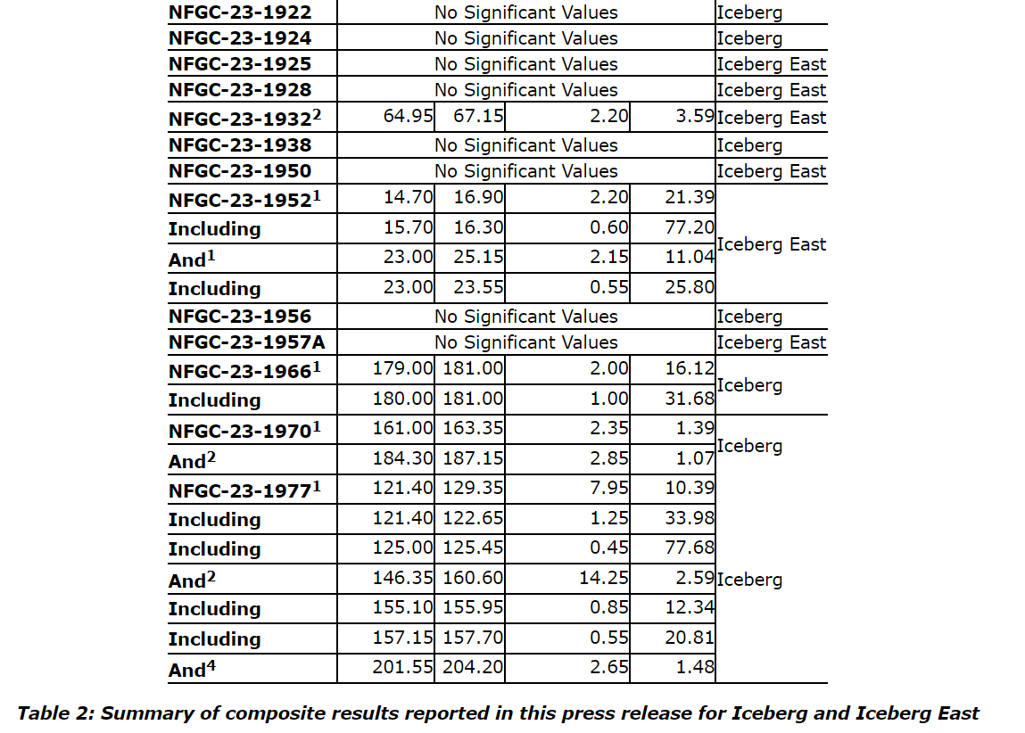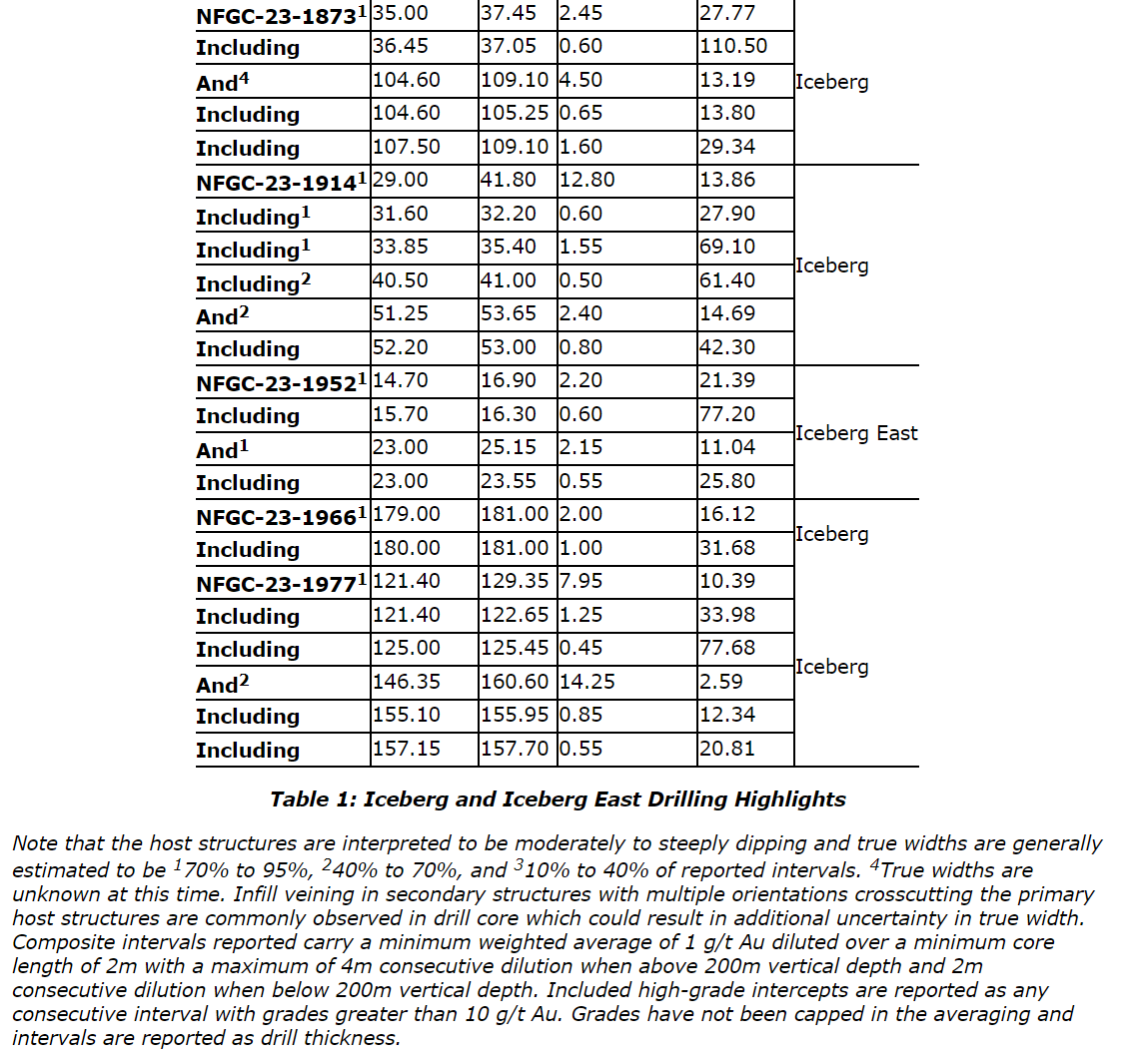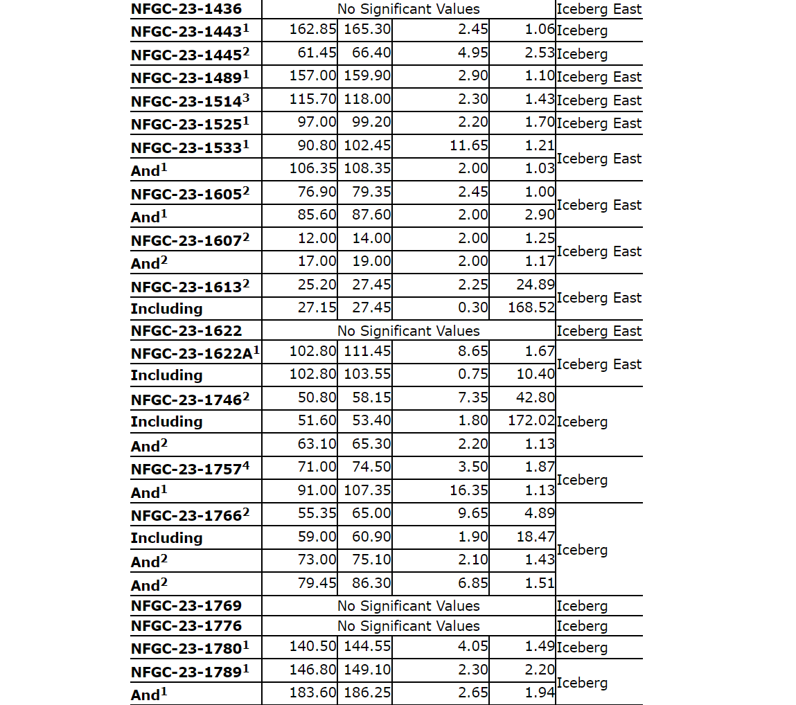 Other notable intercepts from today's release include 12.6 g/t Au over 16.70 m in NFGC-23-1323 and 42.8 g/t Au over 7.35 m in NFGC-23-1746, located 25 m and 80 m along strike to the north of NFGC-23-1820. The intercept of 24.9 g/t Au over 2.25 m in NFGC-23-1613 is located 530 m farther to the east at the far eastern extent of Iceberg East.