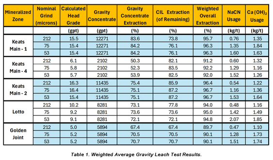 Mr. Simmons commented: "The phase 1 geo-metallurgical characterization and test work program results confirm the high-grade nature of the project and our high gold extraction expectations for Keats Main, Lotto and Golden Joint vein systems. The program further demonstrates that conventional gravity separation and CIL are well-suited recovery methods for gold mineralization at Queensway. Additional flowsheet development work is ongoing to determine if marginal improvements in gold extraction can be achieved."