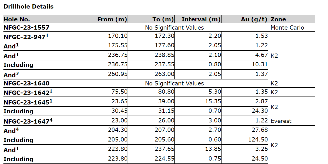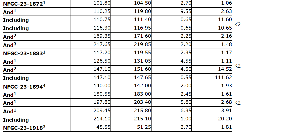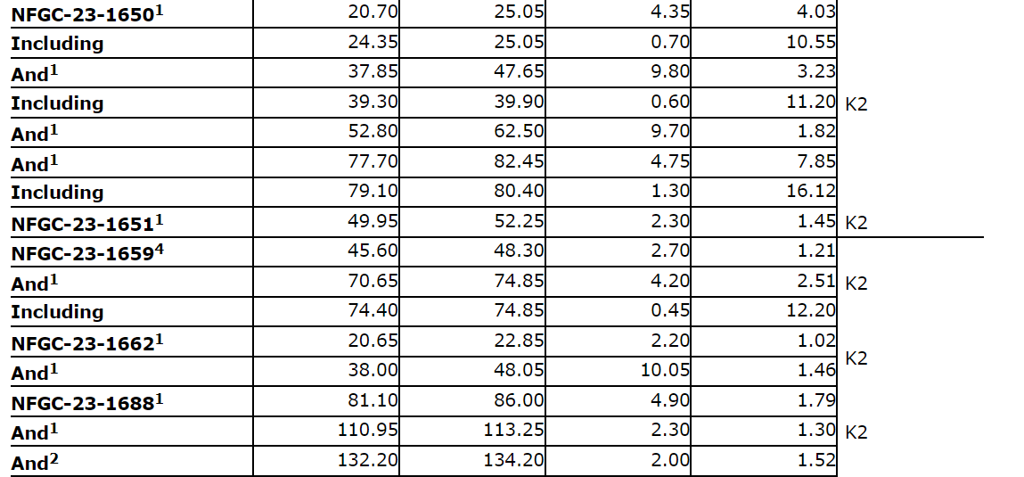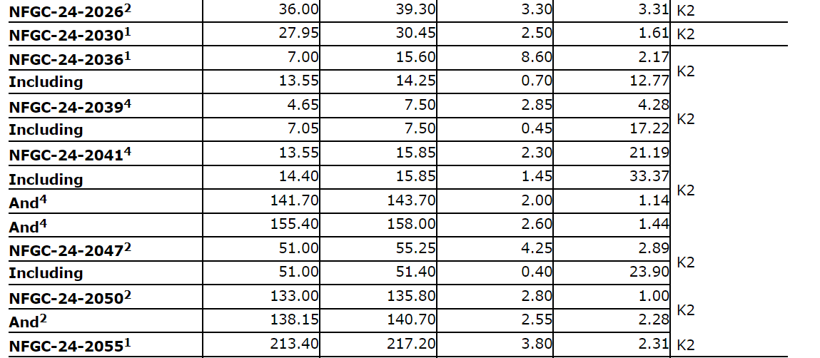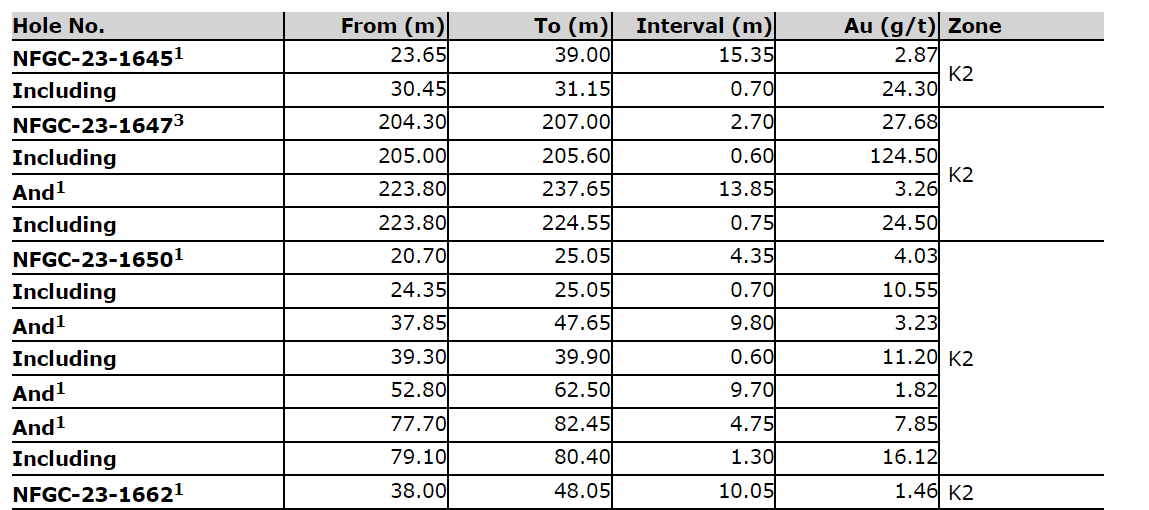 Additional infill results included in today's release were completed in the up-dip, close-to-surface segment of the K2 structure, aimed at extending mineralization to surface. NFGC-23-1650 intercepted 4.03 g/t Au over 4.35 m, 3.23 g/t Au over 9.80 m, 1.82 g/t Au over 9.70 m and 7.85 g/t Au over 4.75 m, and is 43 m down dip of previously reported interval of 8.69 g/t Au over 12.25 m in NFGC-23-1786 (Jan. 31, 2024).
