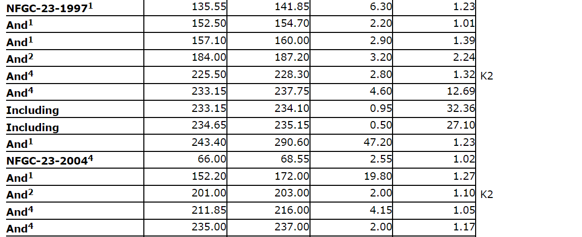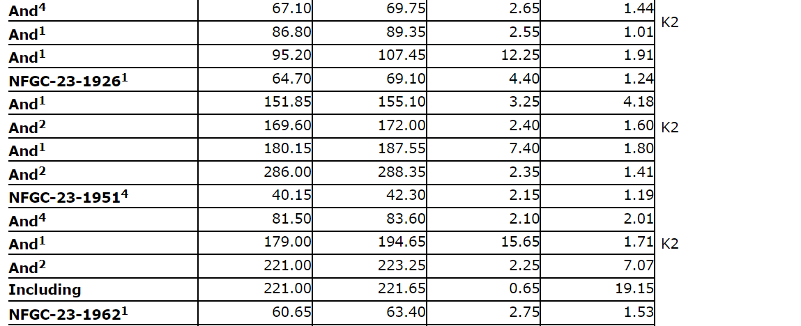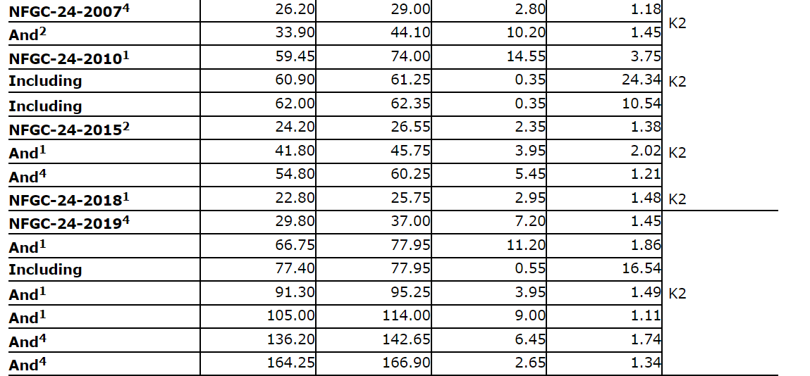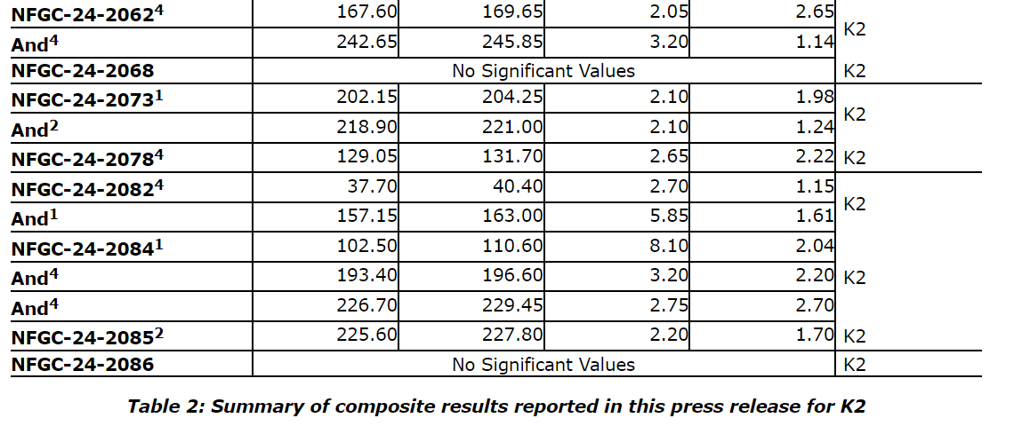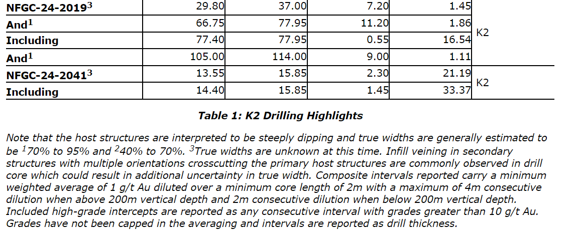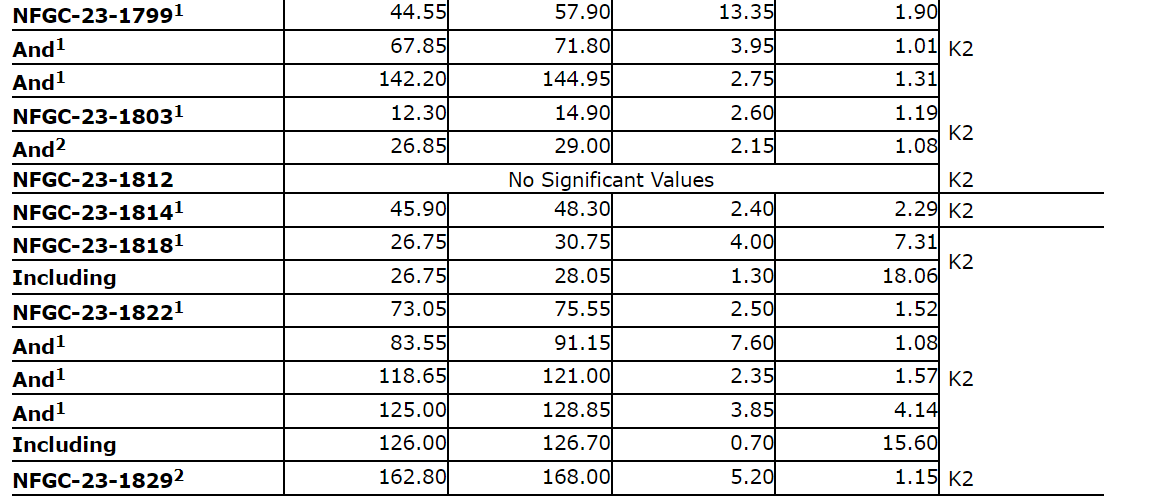 Additional infill results included in today's release were completed in the up-dip, close-to-surface segment of the K2 structure, aimed at extending mineralization to surface. NFGC-23-1650 intercepted 4.03 g/t Au over 4.35 m, 3.23 g/t Au over 9.80 m, 1.82 g/t Au over 9.70 m and 7.85 g/t Au over 4.75 m, and is 43 m down dip of previously reported interval of 8.69 g/t Au over 12.25 m in NFGC-23-1786 (Jan. 31, 2024).