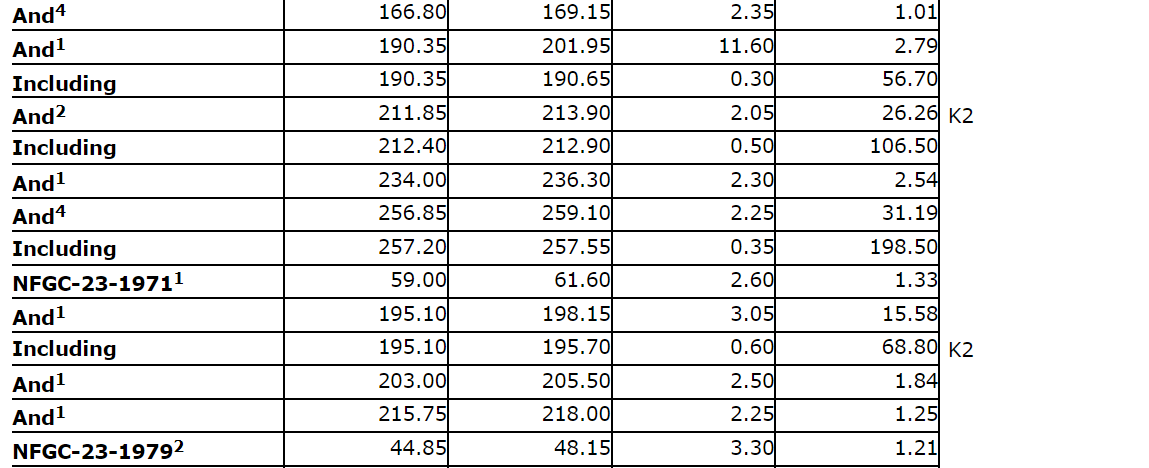 17.8 grams per tonne gold over 13.45 metres in NFGC-23-1986, 12.7 g/t Au over 4.60 m and 1.23 g/t Au over 47.20 m in NFGC-23-1997, 27.7 g/t Au over 2.70 m and 3.26 g/t Au over 13.85 m in NFGC-23-1647, 14.5 g/t Au over 4.50 m in NFGC-23-1883, and 31.2 g/t Au over 2.25 m and 26.3 g/t Au over 2.05 m in NFGC-23-1962 are just a few of the highlight intervals that occur above 200 m vertical that were intercepted as part of a continuing program designed to expand and further define a central high-grade domain within the K2 structure that now spans an area measuring 180 m long by 90 m wide.