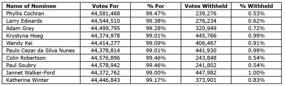 The Company is pleased to announce that the other nine nominees listed in the management information circular dated March 17, 2023, were also elected as Directors of the Board. The detailed results of the vote for the election of directors held at the Shareholder Meeting are set out below.