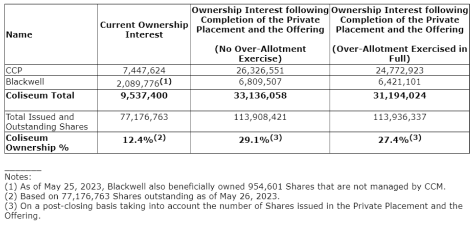 The associated table sets forth Coliseum's share ownership prior to and following completion of the private placement and the offering, with or without the exercise of the overallotment option.