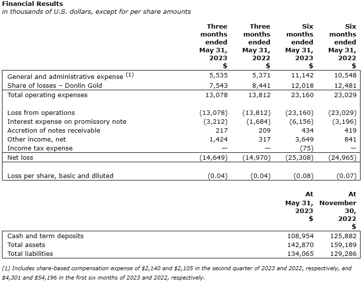 Details of the financial results for the quarter ended May 31, 2023, are presented in the consolidated financial statements and quarterly report filed on Form 10-Q on June 27, 2023 that is available on the Company's website, on SEDAR and on EDGAR. All amounts are in U.S. dollars unless otherwise stated.