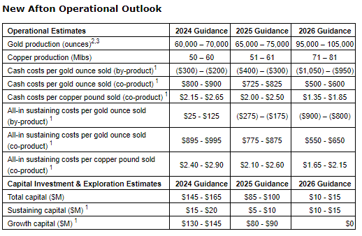 In 2024, the company will report production on a gold and copper basis. Operating expense will be reported on a co-product basis. Consolidated total cash costs1,4 and all-in sustaining costs1,4 will be reported on a by product basis, net of by-product silver and copper sales. Given New Afton's significant copper contribution, the mine will also report cash costs and all-in sustaining costs on a co-product basis, which removes the impact of copper sales revenue and apportions cash costs and all-in sustaining costs to gold and copper activities, and subsequently divides the amount by the total gold ounces or pounds of copper sold, as the case may be, to arrive at per ounce or per pound figures. The company has assumed $22.00 per silver ounce and $3.75 per copper pound, and a foreign exchange rate of $1.32 Canadian dollars to $1.00 US dollar in its three-year outlook.