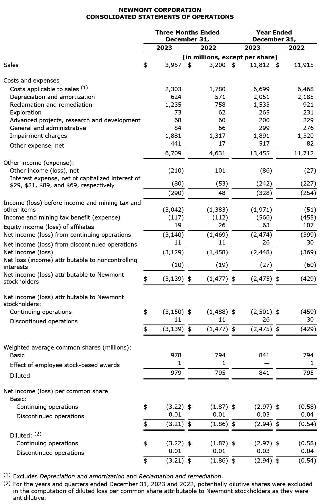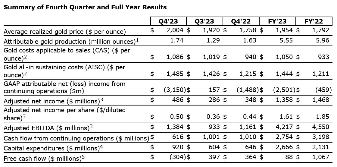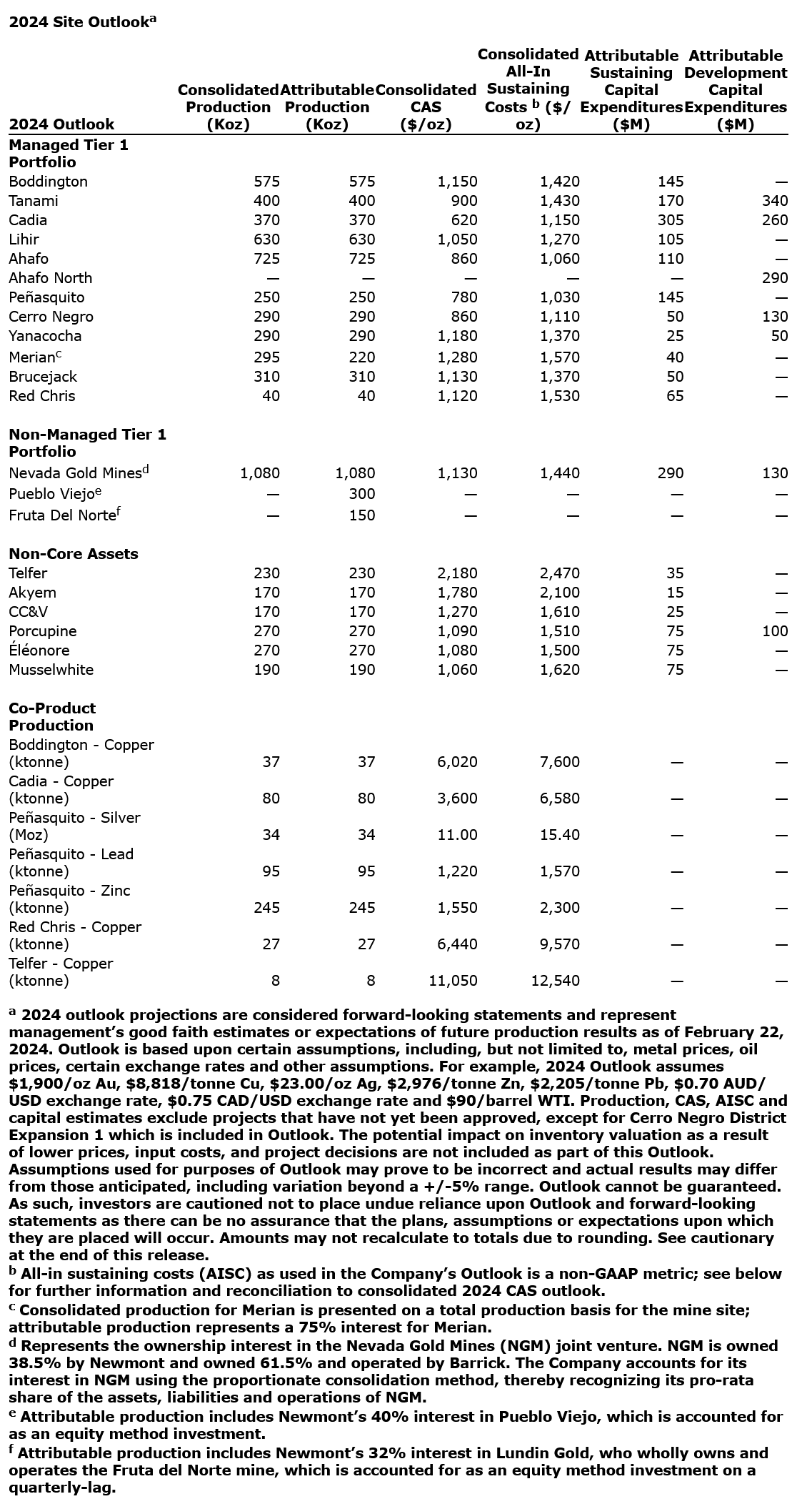 NEWMONT REPORTS FOURTH QUARTER AND FULL YEAR 2023 RESULTS; PROVIDES 2024 OUTLOOK FOR INTEGRATED COMPANY