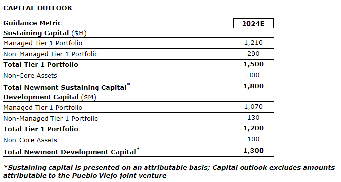 Development capital is expected to be approximately $1.2 billion in 2024 for the Tier 1 Portfolio, as the company focuses on disciplined reinvestment in its most profitable near-term projects. 2024 outlook primarily includes spend for Tanami Expansion 2 in Australia, Ahafo North in Ghana, Cadia Block Caves in Australia and Cerro Negro District Expansion 1 in Argentina. In addition, development capital outlook includes spend related to the company's ownership interest in Nevada Gold Mines including Goldrush. Total Newmont development capital is expected to be approximately $1.3 billion in 2024, incorporating incremental spend for the Pamour project at Porcupine.