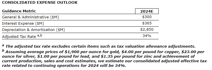 The 2024 outlook for general and administrative costs is expected to increase slightly to $300 million as Newmont continues integration work after the Newcrest transaction. Interest expense is expected to increase to approximately $365 million due to the debt assumed from the Newcrest transaction. Depreciation and amortization is expected to increase to approximately $2.9 billion for the combined portfolio. The adjusted tax rate is expected to remain stable at approximately 34 per centusing a $1,900 per ounce gold price assumption.