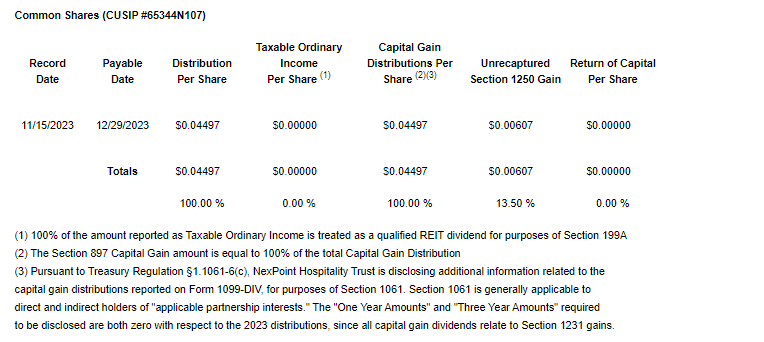 Nexpoint Hospitality Trust has declared 2023 United States tax information in respect of the special distribution paid by the REIT on Dec. 29, 2023 (the special distribution). The special distribution was made to distribute to unitholders all or a portion of the capital gain realized by the REIT from certain transactions completed during the last fiscal year in order for the REIT to continue to be qualified and classified as a real estate investment trust (as defined in the U.S. Internal Revenue Code of 1986, as replaced or amended, from time to time) for U.S. federal income tax purposes.