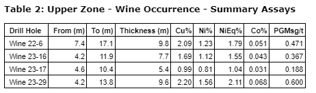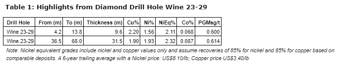 The Company interprets diamond drill hole Wine 23-29 to have intersected an upper, sub-cropping zone, which assayed 2.20% Cu and 1.56% Ni (2.11% NiEq) over 9.6 metres followed by three middle zones that returned lower grade mineralization. The main zone returned 31.5 metres at 1.90% Cu and 1.92% Ni (2.31% NiEq); the greatest length of continuous mineralization intersected to date at the Wine Occurrence. True widths are interpreted to be approximately 80% of intersected widths.