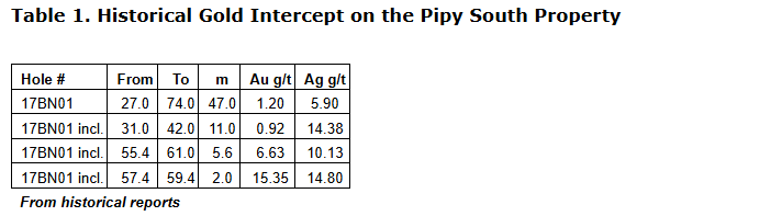 Nican Ltd. has identified a high-priority gold target on its recently acquired claim located adjacent to the Pipy South property. A historical diamond drill hole returned 6.63 grams per tonne Au (gold) and 10.13 g/t Ag (silver) over 5.6 metres (m) within a wider, near-surface zone of mineralization that averages 1.20 g/t Au and 5.90 g/t Ag over 47.0 m. The orientation and true width of the gold-bearing intersection are currently unknown and will be determined by future drilling.