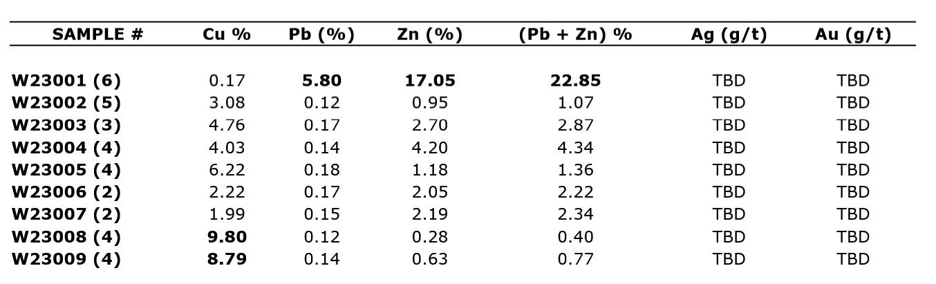 Nine Mile Metals Ltd. has released the XRF (X-ray fluorescence) results for VMS (volcanic massive sulphide) mineralization collected from the Wedge mine site in the world-famous Bathurst mining camp, New Brunswick, Canada. Discovered in 1956, Cominco operated the mine between 1962 to 1968 producing 1.5 million tonnes of predominantly copper ore. Despite a long exploration and operating history, technical data regarding the mine was not required to be reported to the New Brunswick Department of Energy and Mines ("NBDEM"), including drill logs, assay certificates, production figures and underground mine plans. Prior to commencing the 2023 exploration drill program, the ground will be mapped at surface and representative samples analyzed to determine the base and precious metal assay values. Initial samples have been collected at site, cut, and analyzed utilizing an Olympus Vanta 50 portable XRF equipped with a 50Kv workstation and Reflex XRF software. The XRF process included calibrating the machine and utilizing 3 standards in the sample stream (OREAS622, CDN-CGS-10 and CDN-BL-10) twice during analysis. Each sample consisted of numerous cut slabs represented by the number in brackets adjacent to the sample number below. As such, the samples were not homogeneous. Each slab was analyzed in 3 separate locations and the results averaged by the Reflex XRF software. The sum of the averages for each individual sample was divided by the number of pieces, the results of which are presented below. There was a total of 102 data points collected. The same samples have been shipped to ALS Global in Moncton for preparation and certified assaying.