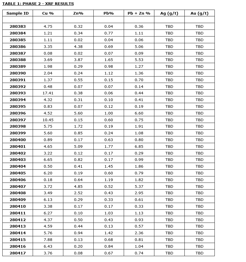 As previously stated in the company's news release dated Sept. 17, 2025, the modelling has focused on determining the geophysics identifying a new western extension and the unmined portions of the deposit, with drill holes targeting a copper-rich lens to the west, and the unexplored depth extension below 150 metres, where recent drilling and historical cross-sections indicate mineralization occurring to a minimum depth of 300 metres. Continued sampling in October uncovered additional samples that demonstrate the robust nature of copper mineralization. A total of 35 samples were cataloged, photographed then analyzed with a portable XRF instrument utilizing an Olympus Vanta 50 portable 50-kilovolt workstation and Reflex XRF software to provide instant real-time geochemical information. Each sample was analyzed in three separate locations and the results averaged by the Reflex XRF software. The XRF process included calibrating the machine and utilizing two standards in the sample stream (OREAS622, CDN-BL-10) twice during analysis. The results are presented in the attached table. The samples have been forwarded to ALS Global in Moncton, N.B., for preparation with final geochemical analysis conducted in North Vancouver, B.C.