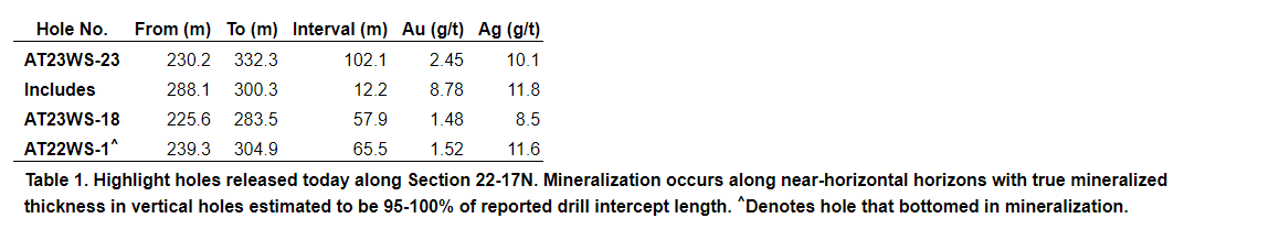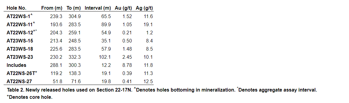 A good example of this is seen along Section 22-17N, where historical hole DHRI-11-15C had no other hole eastward along the section to tie to. Consequently, the Gustavson 2020 resource model extended the thin, low-grade intercept (0.28 g/t Au over 67.1 m) to the east and gradually pinched it out, showing no evidence for more resource to the east. In stark contrast, today's banner intercept in AT23WS-23 (102.2 m at 2.45 g/t Au), located only 50 m east of DHRI-11-15C, is considerably thicker and nine times stronger in terms of grade compared with DRHI-11-15C, significantly changing the company's interpreted resource potential along this section. Consequently, the current drilling program is centred on expanding the WAG mineralization northward, southward and to depth.