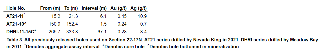 Cal Herron, exploration manager of Nevada King, commented: "Section 22-17N generally mimics the structural, stratigraphic and mineralization patterns seen in adjacent Section 22-16N (released Feb. 13, 2023) and in sections previously released farther south along lines 22-5N through 22-10N. We are seeing a northward narrowing of mineralization along the AMFZ starting at sections 22-16N and 22-17N, and this is probably due to the northerly trending Atlanta King fault having been faulted out just north of the pit. At the same time, we see a new high-grade zone developing within the WAG between the West Atlanta No. 1 and West Atlanta No. 2 faults. The thick, higher-grade intercept in AT23WS-23 is more typical of intercepts seen within the narrow graben blocks between the Atlanta King and East Atlanta faults, so the West Atlanta fault No. 1 may be the western analogue of the Atlanta King fault, which acts as an important fluid conduit responsible in part for the high-grade mineralization seen along the eastern side of the AMFZ."