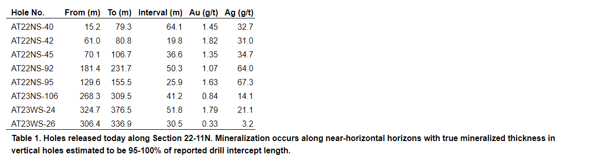 The three remaining holes released today are located west of the Atlanta pit and continue to extend mineralization northward along the West Atlanta graben (WAG), highlighted by AT23WS-24, which intercepted