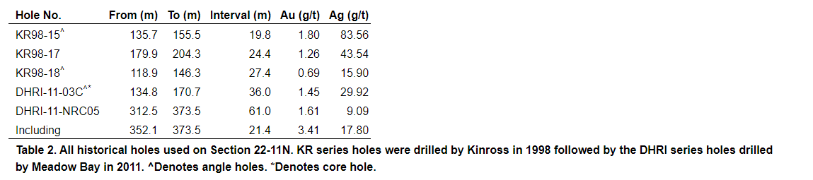 51.8 m of 1.79 g/t Au. At the far western end of Section 22-11N, historical hole DHRI-11-NRC05 reported