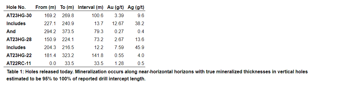 in AT23HG-30 and 2.67 g/t Au over 73.2 m