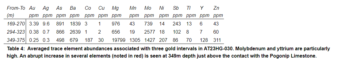 Aside from the high gold grade and the mineralized Pogonip limestone at depth, AT23HG-30 also returned significant molybdenum and yttrium values. An attached table compares averaged elemental abundances for three distinctly separate gold zones in this hole. Exhibiting a strong spatial relationship with gold, Mo is enriched starting at 195 m depth and continues to the bottom of the hole at 392 m, averaging 1,227 parts per million (or 0.12 per cent) Mo over 197 m, with individual 1.52 m drill intervals ranging up to 8,785 ppm (0.87 per cent) Mo. The company is continuing to review these results and their potential significance.