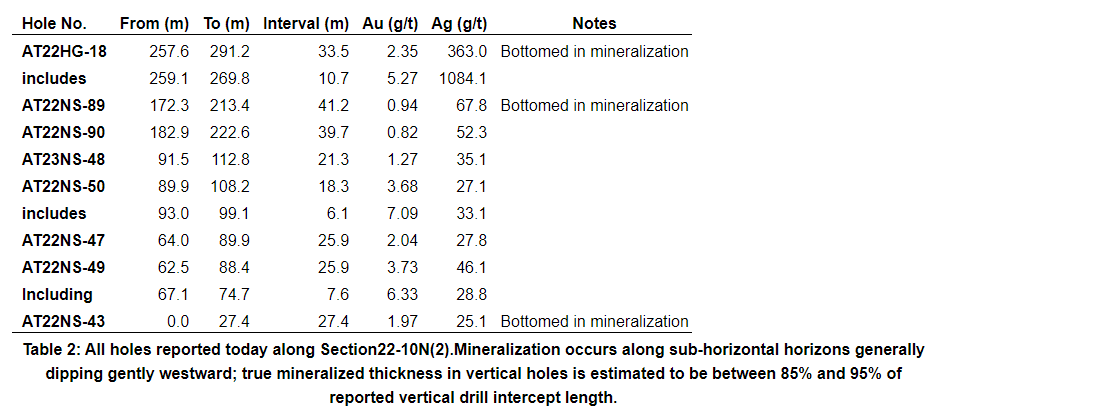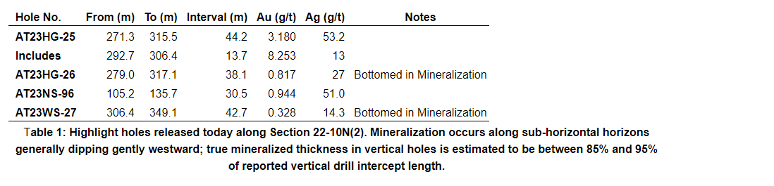 33.5 metres grading 2.35 grams per tonne gold and 363 grams per tonne silver, including 1.08 kilograms per tonne Ag over 10.7 m. Today's AT23HG-25 (44.2 m at 3.18 g/t Au and 53 g/t Ag) is located 14 m west of AT22HG-18, thus extending the high-grade mineralization farther westward into the WAG from the West Atlanta fault.