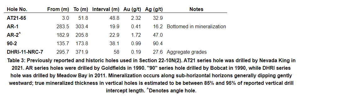 Cal Herron, exploration manager of Nevada King, commented: "Nevada King's drilling appears to show that historic holes consistently under estimated interval grades, primarily from not drilling near higher-grade feeder structures and not fully penetrating the mineralized zones. Our drilling continues to discover new zones of mineralization that were not intersected in the historic programs, including areas of high-grade mineralization proximate to key subvertical fault structures. Based on our drill results to date and ongoing modelling of the mineralization, we are optimistic that we can significantly increase the size and grade of the resource base at Atlanta from that reported in the Gustavson (2020) report."